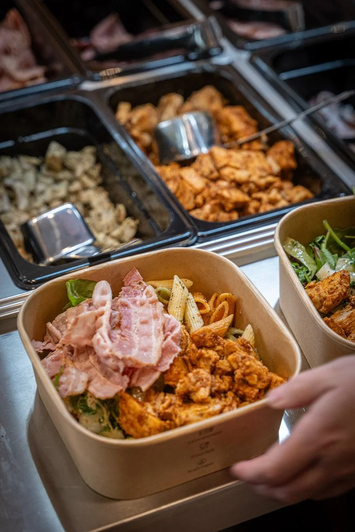 Huvudingrediensen är dagens protein – det kan vara varmrökt lax, honungsgratinerad chèvre, grillad halloumi, eller något helt annat. Vi varierar varje dag för att ge dig nya smaker att upptäcka!